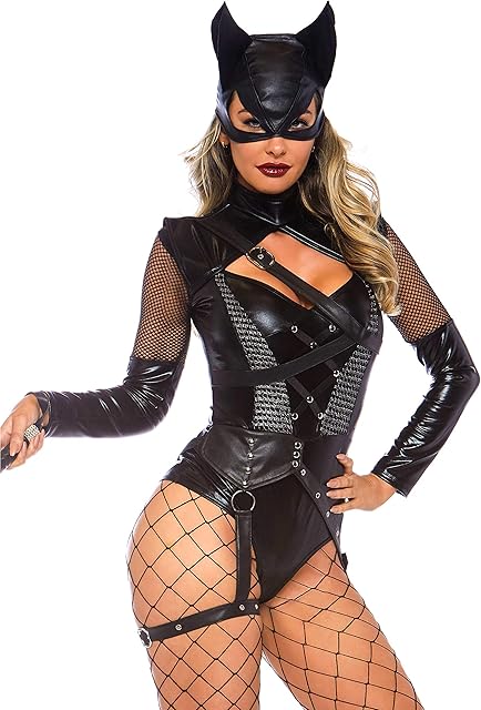 womens 2 Pc Villainess Vixen Bodysuit Costume With Attached Garter, Hooded Mask