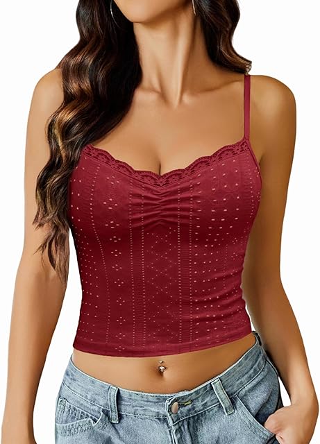 Order Womens Lace Camisole Spaghetti Strap Tank Top Sweetheart Neck Eyelet Pleated Bustier Tops Slim Fit Y2k Cami today for a best price.