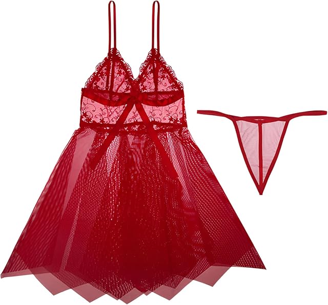Womens Lace Lingerie Sheer See Through Babydoll Strap V Neck Nightwear Sexy Chemise Teddy Nightie Nightgowns for Women Sexy Red