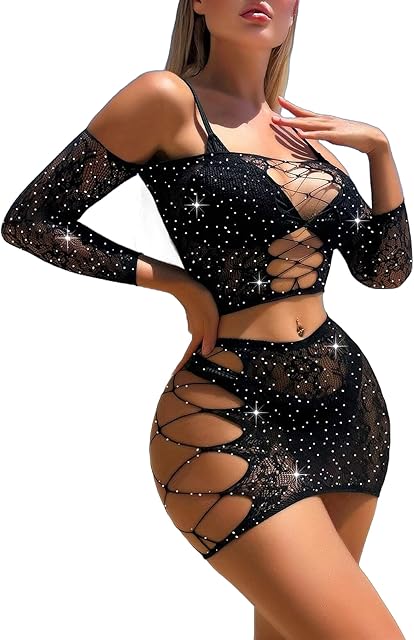 Womens Lingerie Set Fishnet Babydoll Sexy Mesh Chemise Rhinestone Fishnet Lingerie