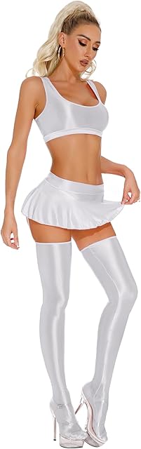 Womens Oil Glossy Athletic Lingerie Set Racer Back Crop Top with Mini Ruched Skirt Stockings