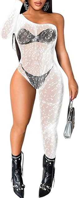 Order Womens One Shoulder Fishnet Bodysuit, Sexy Leopard Lace Jumpsuit Rave Club, Body Stockings Exotic Wear Dancer Outfits today for a best price.
