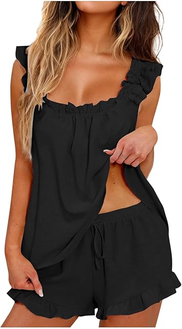 Womens Pajamas Set 2 Piece Ruffle Pj Soft Cute Tank Top and Shorts Sleepwear Set Bridal Pajama Summer Loungewear Set
