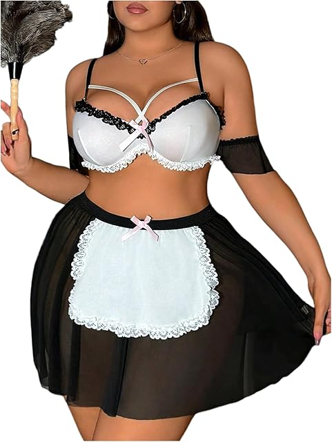 Order Womens Plus Size 3 Piece Maid Outfit Lingeire Set Floral Lace See Through Sheer Mesh Costume today for a best price.