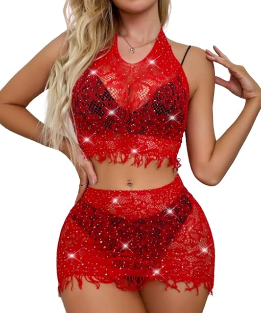 Womens Rhinestone Fishnet Lingerie Set Sexy Lace Chemise Nightgown Lace BIkini Set Sexy Full Slips Sleepwear