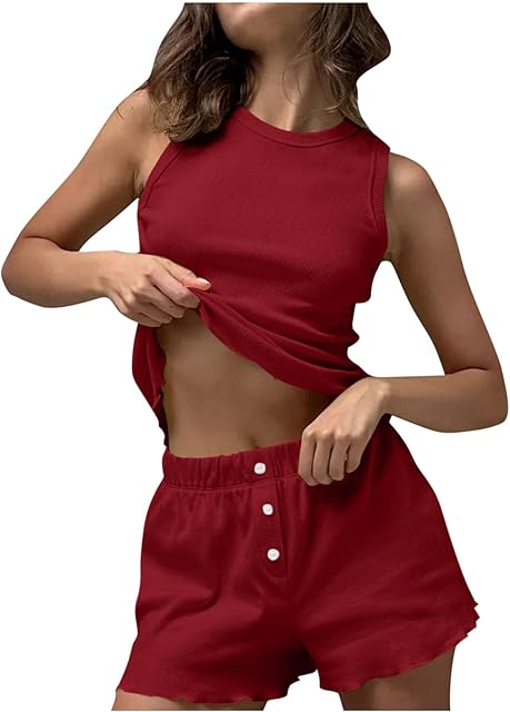 Womens Ribbed Tank Top and Shorts Set Two Piece Summer Outfits Sleeveless Sleep Cami Pj Loungewear Pajamas Set