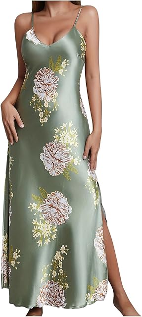 Womens Satin Long Nightgown Sexy Side Split Silk Floral Graphic Lingerie Soft Spaghetti Strap Nightwear Nightdress