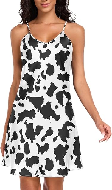 Womens Satin Nightgown Spaghetti Strap Cow Print Sleepwear Sexy V Neck Lingerie Dress Nightwear