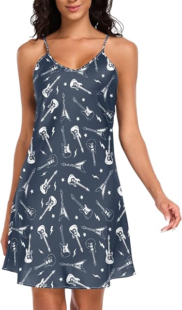 Womens Satin Nightgown Spaghetti Strap Guitar Rock Sleepwear Sexy V Neck Lingerie Dress Nightwear