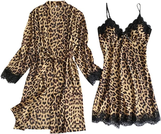 Womens Satin Silk Leopard Lingerie Sets Sexy Lace Cami Dress with Robes 2 Piece Slutty Sleepwear Bathrobe Nightdress
