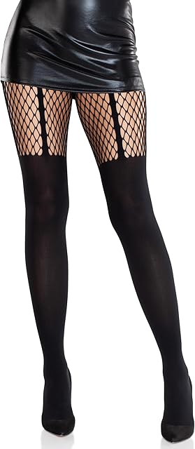 Order Womens Seamless Black Fishnet Tights for Women with Opaque Garter Illusion and Net Thigh Detail, Black, One Size today for a best price.