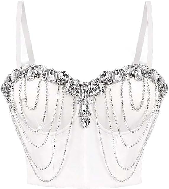 Womens Sexy Bustier Glitter Rhinestone Gem Chain Corset Top Spaghetti Strap Wedding Party Crop Top Going Out Y2k Top