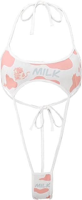 Womens Sexy Cow Spot Print Lingerie Bodysuit Halter Neck Lace-up T-Back One Piece Mini Leotard
