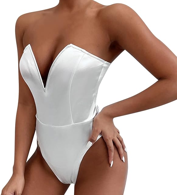 Womens Sexy Deep V Neck Tube Top Bodysuits Strapless High Cut Thong Leotard Party Nightclub Clothing with Snap Cortch