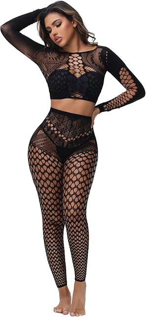 Order Womens Sexy Fishnet Lingerie Sets Footless Fishnet Stockings Hollow Out Long Sleeve 2 Piece Mesh Bodysuits today for a best price.