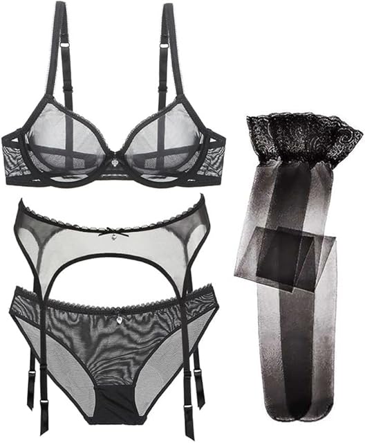Women’s Sexy Lingerie Set with Garter Belt Stocking See Through Matching Bra and Panty 4 Piece