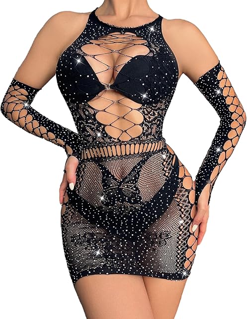 Women’s Sexy Lingerie Sparkle Rhinestone Fishnet Dress One Piece Mini Babydoll Cutout Mesh Outfits