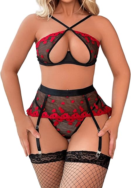 Order Women’s Sexy Lips Print Criss Cross Lace Mesh Cut Out Garter Belt Lingerie Set with Stocking today for a best price.