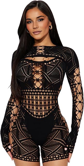 Order Women’s Sexy Long Sleeve See Through Hollow Out Sheer Ultra Stretchy Mesh Bodysuit today for a best price.