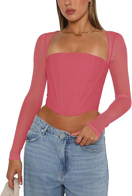 Order Women’s Sexy Mesh Long Sleeve Boned Corset Top Trendy Y2K Square Neck Going Out Bustier Crop Tops today for a best price.