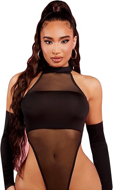 Order Women’s Sexy Mesh See Through Bodysuit with Sleeves Mock Neck High Cut Leotard Top today for a best price.