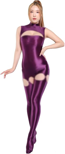 Women’s Sexy Oil Shiny Glossy Bodystocking Long Sleeve Bodysuit Catsuit Bodycon Dress with Stockings