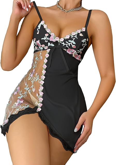 Order Women’s Sexy Sleepdress Pajamas Set Floral Embroidery Lace Trim Satin Chemise Nightgown Cami Slip Lingerie, Black S today for a best price.