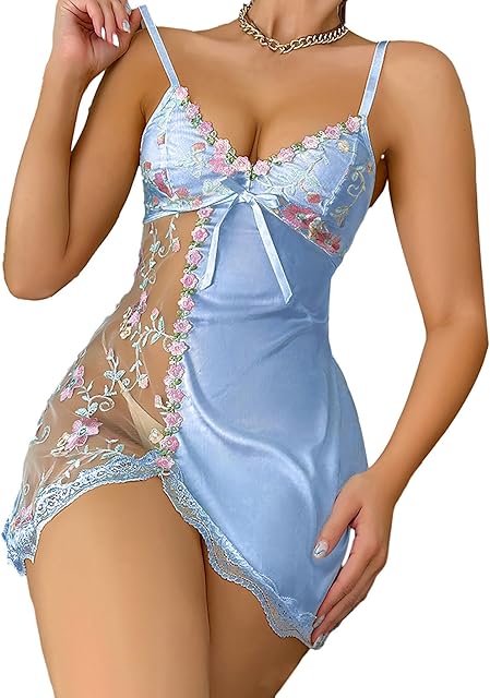 Order Women’s Sexy Sleepdress Pajamas Set Floral Embroidery Lace Trim Satin Chemise Nightgown Cami Slip Lingerie, Blue S today for a best price.