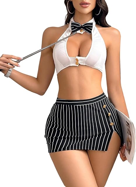 Order Women’s Sexy Teacher Lingerie Cosplay Costume Crop Top Striped Skirt Thong Set Secretary Outfit today for a best price.