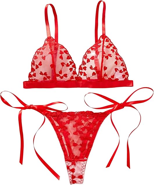 Women’s Sheer Mesh Sexy Lingerie Heart Embroidery Triangle Bra Panty Nightwear Set