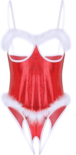 Women’s Shiny Metallic Christmas Costume Lingerie Mrs Santa Claus Spaghetti Straps Sexy Teddy Bodysuit
