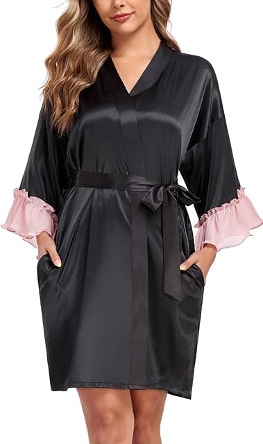 Women’s Short Satin Robes Lightweight Kimono Bathrobe Ruffle Hem Bride Bridesmaids Wedding Party Sleepwear