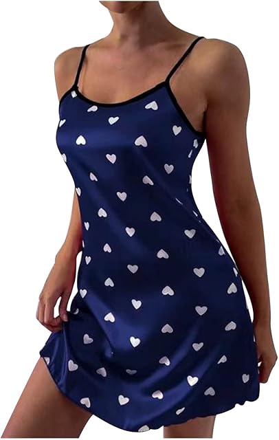 Women’s Silk Satin Heart Print Nightgowns Sleepwear Sleeveless Nightwear Spaghetti Strap V Neck Cami Mini Dress