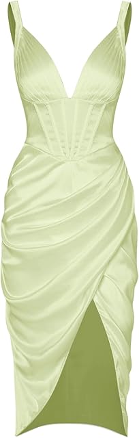 Order Women’s Silky Pleated Draped Bustier Corset-Style Deep V Neck Midi Dress today for a best price.