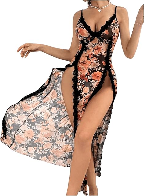 Order Women’s Spaghetti Strap Lace Floral Nightgown Split Thigh Midi Slip Dress Sexy Sleepwear Cami Dress today for a best price.