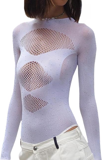 Order Women’s Sparkle Rhinestone Fishnet Lingerie Sexy Hollow Out See Through Bodysuit Leotards Long Sleeve Tops today for a best price.