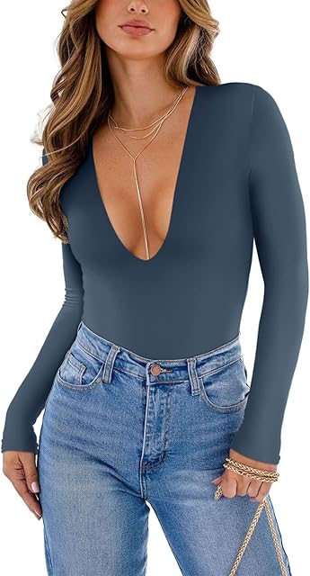 Order Women’s Trendy Sexy Plunge Deep V Neck Long Sleeve Bodysuit Double Lined Going Out T Shirt Tops today for a best price.