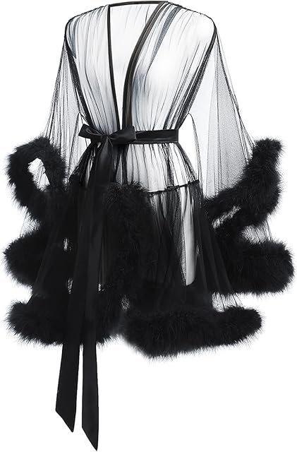 Women’s Tulle Feather Robe Long Bridal Robes Sexy Tulle Lingerie Maternity Bathrobe Photoshoot Illusion Wedding Scarf Party Nightgown Sexy Sheer Mesh Fur Bridal Illusions Boudoir Christmas Lingerie
