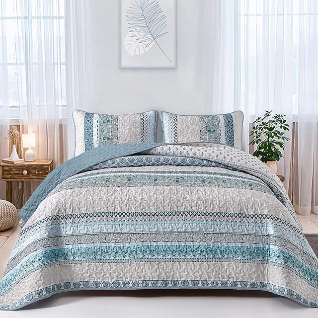 WONGS BEDDING Boho Quilt Set King Size, Blue Bohemian 3 Pieces Quilt Sets, Lightweight Bedspread Coverlet Bedding Set for All Season (104″x90″)