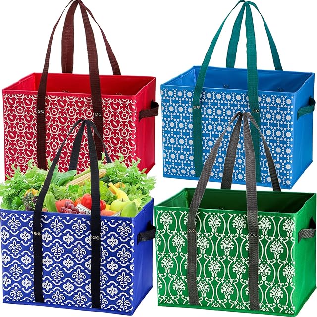WUWEOT 4 Pack Reusable Grocery Bags, Large Shopping Box Tote, Foldable Washable Storage Bins with Reinforced Bottom Heavy Duty Handles for Fruit Vegetable Clothes Toys and Picnic