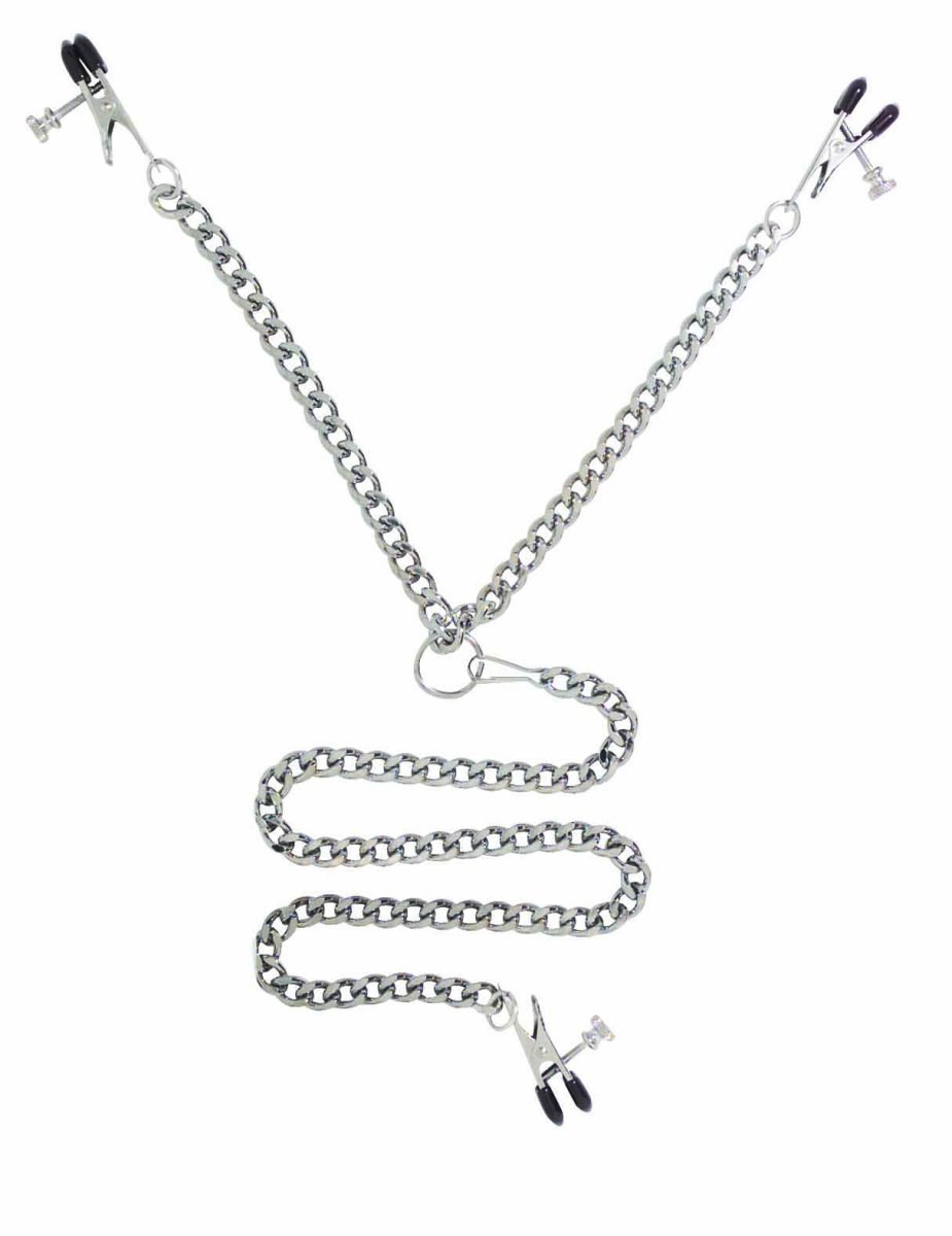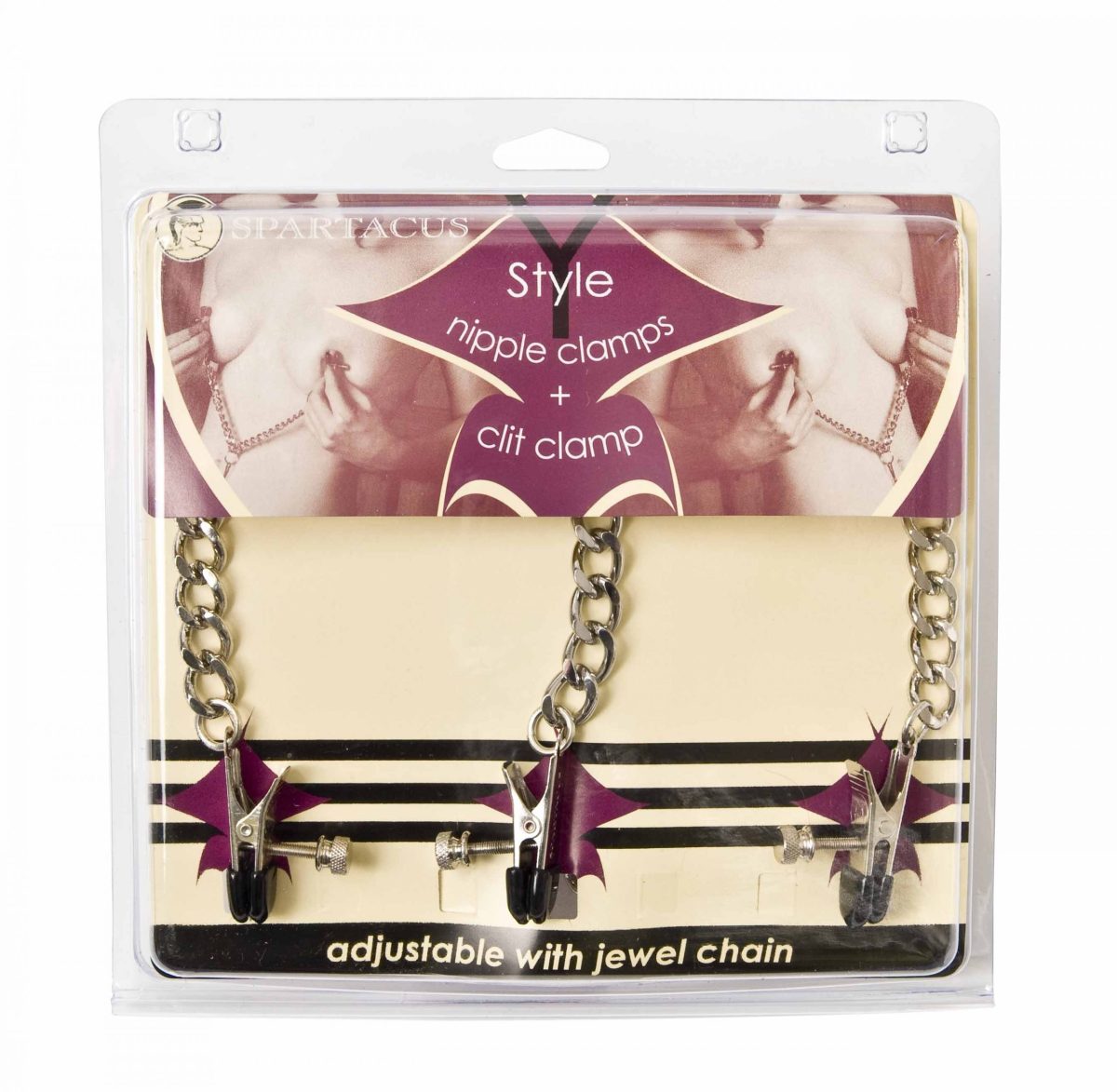 Y Style Nipple Clamps Adjustable Broad Tip with Clit Clamp. Y-style attached nipple clamps and clitoral clamp with medium alligator style clamps. The clamps are adjustable, and the clitoral clamp chain detaches from the nipple clamp chain, so you can choose how much to take! The medium clamps are good for general use. A detachable clitoral clamp makes y-style nipple clamps versatile and tempting. Alligator ends. Clitoral clamp and nipple clamps feature a broad tip covered with black rubber for pleasure pressure not pain. Tension is controlled by the screws on the top each end. Jewel chain. Weighs 0.57 pound. Sex toy model Go Go Amy. Spartacus A Passion For Quality Catalog page 14.