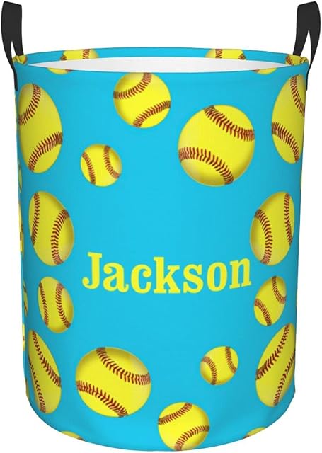 Order Yellow Softball on Blue Personalized Laundry Basket Name Clothes Hamper with Handles Waterproof Laundry Storage Baskets for Bedroom Bathroom Decor. today for a best price.