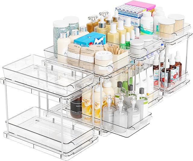 Yieach 4 Pack Under Sink Organizers and Storage,Clear Acrylic Bathroom Organizer and Cabinet Organization for Makeup,Medicine,Two Tier Pull Out Cabinet Organizer Drawers for Pantry,Vanity Storage Bins