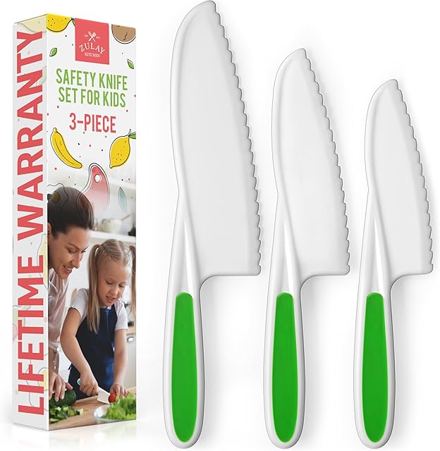 Order Zulay 3-Piece Kids Knife Set for Real Cooking & Baking – For Toddler Cutting Fruits, Veggies, & Cake – Children’s Montessori with Serrated Edges – Safe & Fun Lettuce Knife (Green) today for a best price.